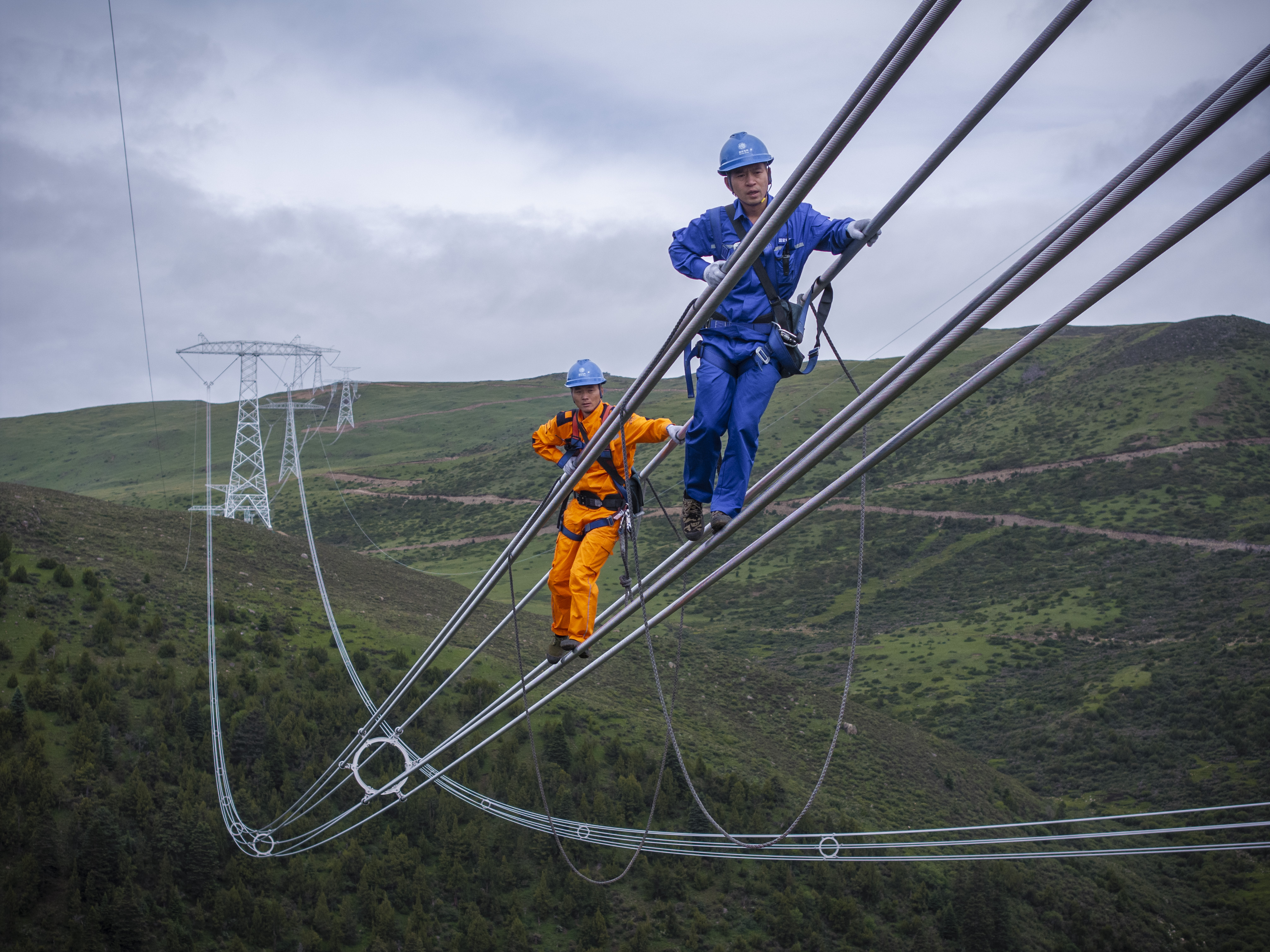 2025年7月1日,作业人员正在金沙江上游—湖北±800千伏特高压直流输电工程四川甘孜段走线验收。(郑自豪 摄)