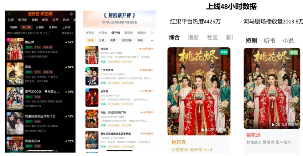 12月7日上线,仅48小时即“霸榜”各大平台,在多个平台占据飙升榜总榜第一;至12月14日,在抖音、爱奇艺、番茄等平台全平台播放量突破2亿……成都高新区企业四川超维光年文化传媒有限公司(以下简称“超维光年”)推出的首部古装短剧《桃花烬》,目前在红果短剧平台热度值,超过5400万,成为近期短剧赛道的“黑马”。